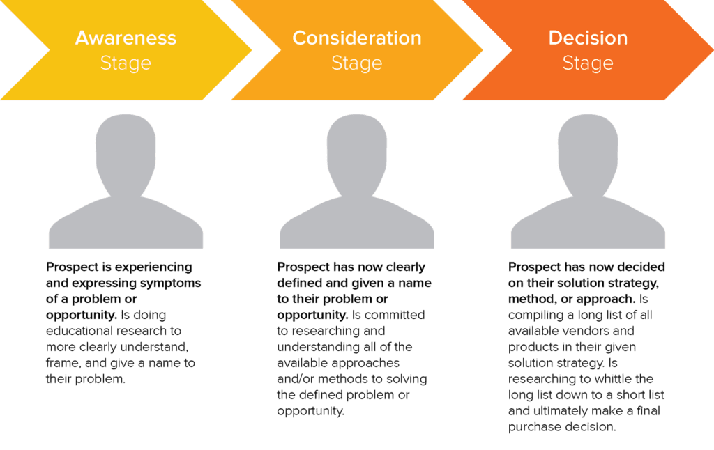 In simple terms, a potential customer must recognize their need or challenge (awareness), they will consider all the options that will meet their needs, and finally, after considering all the available products, they’ll decide on the right product to purchase.